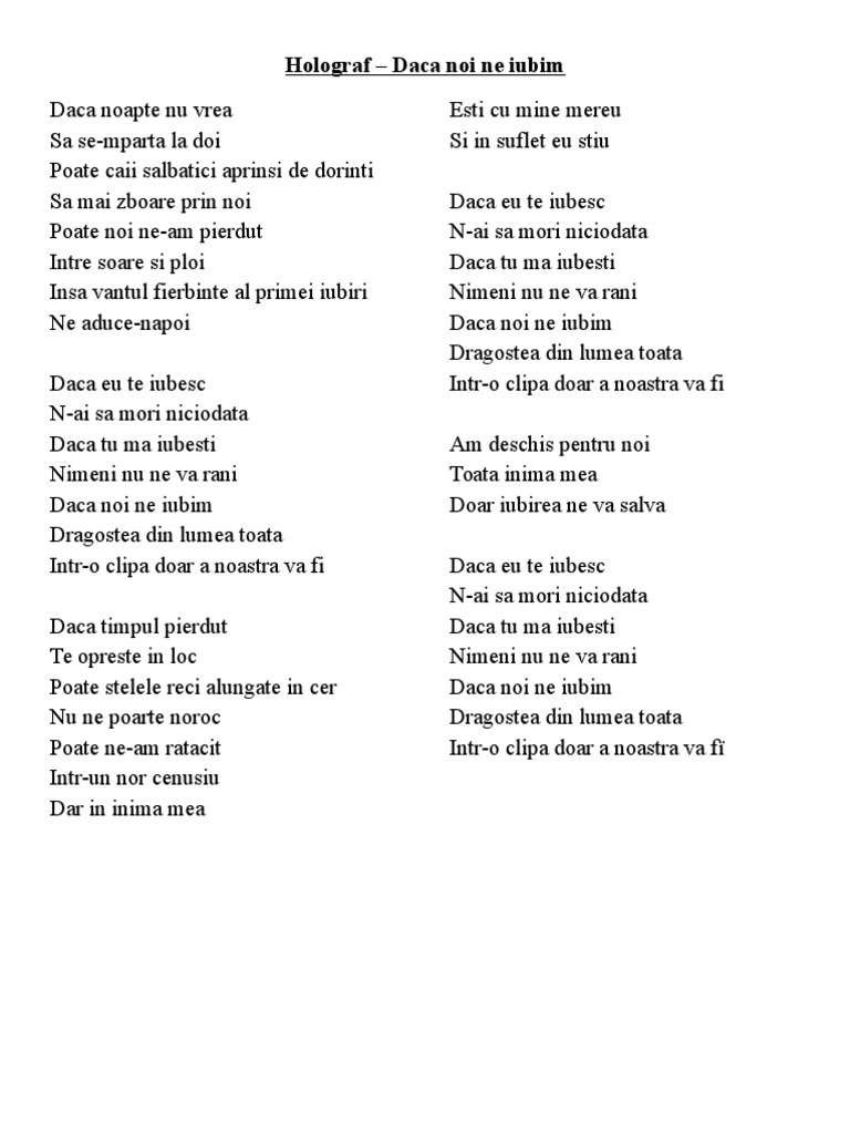 Holograf sa nu mi iei niciodata dragostea lyrics. .video 2003, holograf pierd inaltimea din ochii tai official video, holograf dimineata in alta viata official video, holograf daca noi ne iubim live in garajul europa fm, holograf fara ea official video, holograf primavara incepe cu tine, holograf da mi iubirea ta official music video, dinamo bucuresti daca noi te. Holograf dacă noi ne iubim live vedere de la costinești.